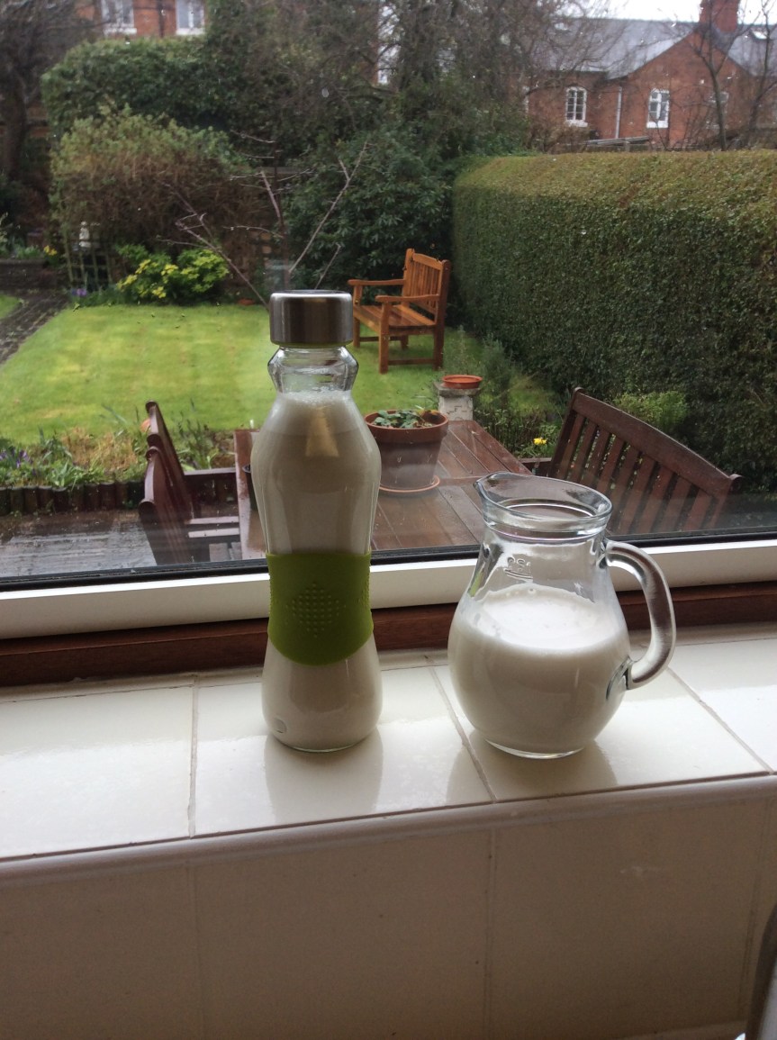 Once we started making nut milk, we needed something to store it in! I prefer glass to plastic and we found a great 500ml glass bottle by Grip & Go on Amazon which, if you’re like me and have a dodgy grip, is so much easier to hold: it has a thinner middle around which is a textured silicone grip. You can get them in many colours and two sizes, they are dishwasher safe apart from the lid and they don’t leak. I originally had a glass jug with a plastic lid, but it was neither airtight nor leakproof so the milk went off quicker and you couldn’t shake it up without getting splashed.