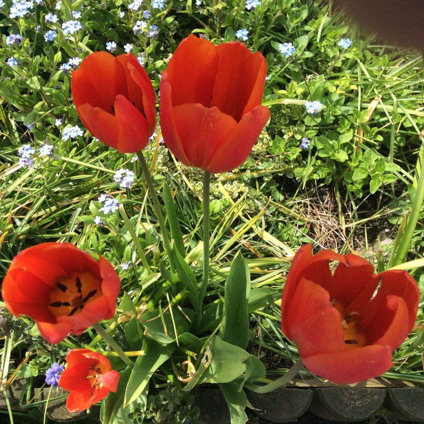 imageThis gorgeously light and delicate smoothie was created on a beautiful Spring morning and I couldn’t resist adding a photo of these striking red tulips in amongst the forget-me-nots – the smoothie looks a bit peely-wally by comparison (Scots: look it up! One for you Scribbleartie 😉)