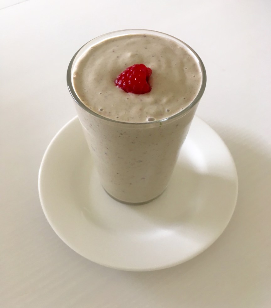 I had a handful of raspberries, an over-ripe nectarine and a handful of coarsely ground organic red peanuts left over from making a chilli-burger (see recipe here), so as they had become friends in the fridge I thought they would get on well together in the blender!
