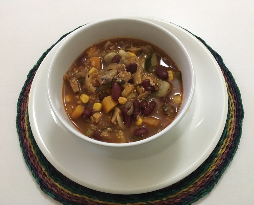 I sprinkled on some nutritional yeast before eating, but that’s optional. You can have tortillas or crisp homemade bread to accompany the chilli.